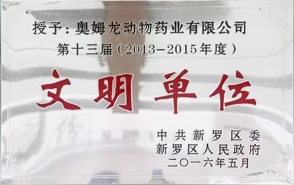 20165月,奥姆龙公司喜获中共新罗区委、新罗区人民政府授予的“第十三届(2013-2015年度)文明单位”称号。近年来,福建奥姆龙生物工程有限公司紧紧围绕全区经济社会发展大局和工作目标任务,以创建区文明单位为目标,深入持久开展文明创建活动,多措并举,狠抓落实。公司作风不断改善,服务水平不断提高,文明形象不断提升,工作不断创新,实现了精神文明创建和企业改革发展双促进、双丰收。