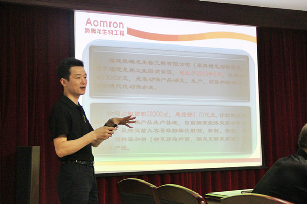 随后技术总监郭金权老师根据当前养猪现状及养猪场的现象指出,把猪养好需审时度势,以“适为宜”,把握好平衡猪群与病原才能相安无事。并详细介绍了将要推出的新产品“姆源康”。