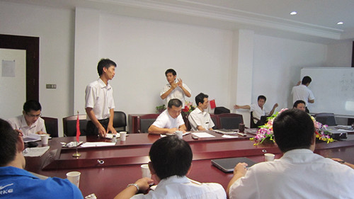 7月份销售例会在优秀员工的表彰中拉开帷幕。本次会议主要针对目前市场上遇到的各种问题进行讨论并取得解决方案。技术总监郭金权切合市场上常见的病例为销售经理们作关于公司产品的用药方案,使公司产品更好的服务于养殖业?;嵋橹谢庇芗喑萄酌饕蕴致邸⒒ザ?、授课的形式提高销售经理的业务技能。