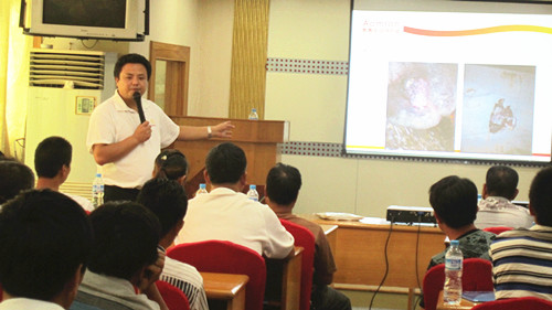 会议上,技术总监郭金权讲解病情,为养殖户排忧解惑。