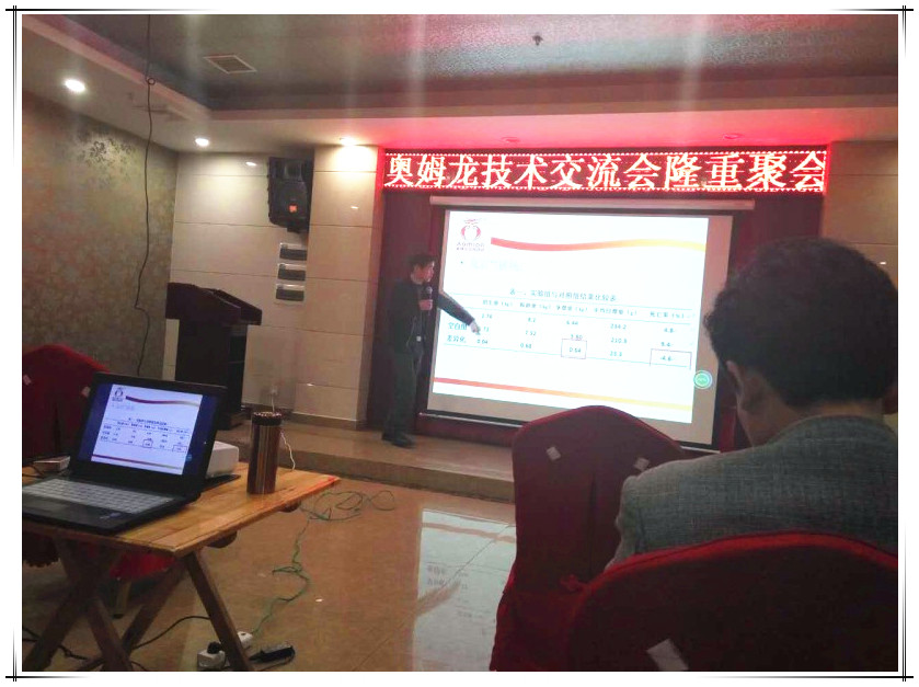 2016年4月8日,公司在湖南省永州市召开技术推广会议?;嵋橛晒炯际醪坑嘟ɡ鲜φ攵浴兜鼻澳钢聿竽趟蛔愕脑蚣岸圆摺氛庖豢翁?,结合公司的产品疗效及使用方法,做了详细系统的讲解,会议现场互动氛围热烈,养殖朋友们纷纷表示通过学习加深了对奥姆龙公司产品的了解,进一步提升了健康养殖的理念!