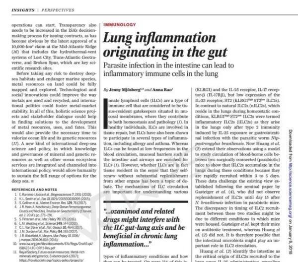 2018年,《科学》杂志发表的一项重要研究,参与机体的稳态和哮喘和慢性阻塞性肺病等病理过程的天然淋巴细胞会从肠道迁移到肺部参与肺部免疫反应。印证了肺与大肠密切的关联性。