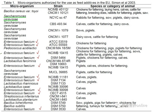 早在2006年后欧盟全面开启“饲料禁抗”之前,2003年欧盟批了26株益生菌,其中屎肠球菌(Enterococcus faecium)占了10株(见下图打钩),是最多的益生菌菌株,涵盖宠物、猪、禽、奶牛和肉牛。