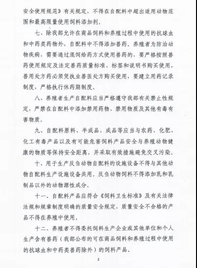 八、养殖者生产自配料应当严格遵守我部有关禁止性规定,严禁在自配料中添加禁用药物、禁用物质及其他有毒有害物质。