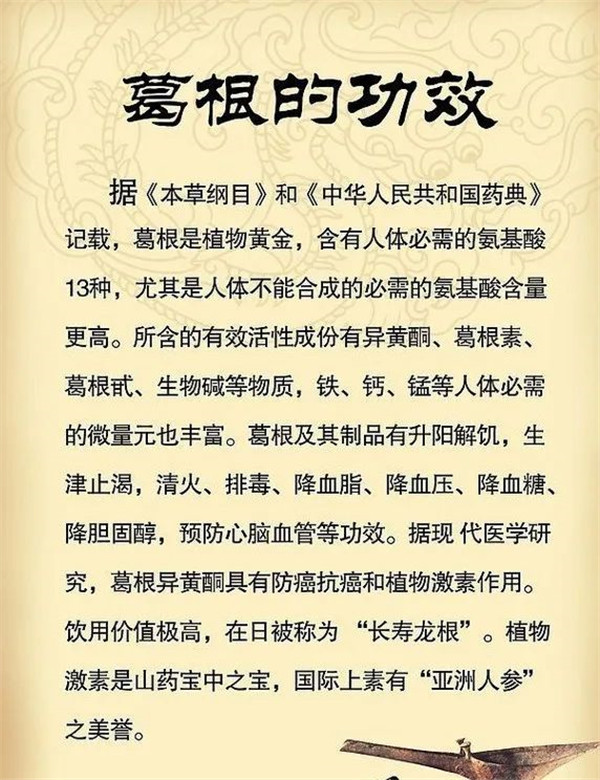 葛根内含12%的黄酮类化合物,如葛根素、大豆黄酮苷、花生素等营养成分,还有蛋白质、氨基酸、糖、和人体必需的铁、钙、铜、硒等矿物质,是老少皆宜的名贵滋补品,有“千年人参”之美誉。早在汉代张仲景的《伤寒论》中就有“葛根汤”这一著名方剂,至今仍是重要的解表方?!侗静菡濉肺礁鸶白钅芸⑵⑽盖逖糁?。