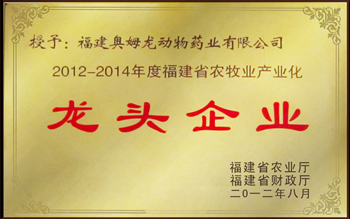 根据省政府《关于进一步加快农业产业化龙头企业发展的若干意见》、省农业厅与财政厅联合印发的《福建省农牧业产业化龙头企业认定和管理办法》,并突出“特色、高新、绿色”特点,经逐级推荐、专家评审、网上公示,确定福建奥姆龙动物药业有限公司为2012-2014年度福建省农牧业产业化龙头企业。