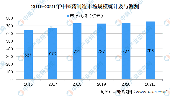 中国是仅次于美国的全球第二大制药市场。其中,我国中医药制造市场从2016年637亿元增至2020年737亿元,年均复合增长率为3.7%。中商产业研究院预测,2021年我国中药制药市场规模将达到753亿元,呈上升趋势。