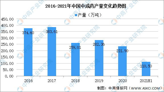 中成药是以中药材为原料,在中医药理论指导下,为了预防及治疗疾病的需要,按规定的处方和制剂工艺将其加工制成一定剂型的中药制品,是经国家药品监督管理部门批准的商品化的一类中药制剂。数据显示,2021年1-2月我国中成药产量110.5万吨,同比增长10.5%。
