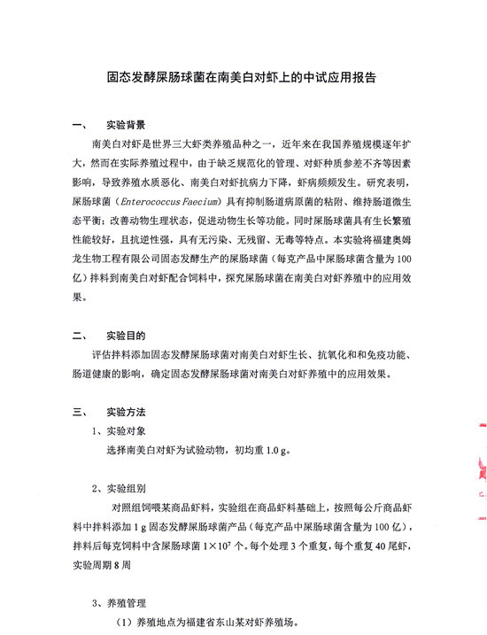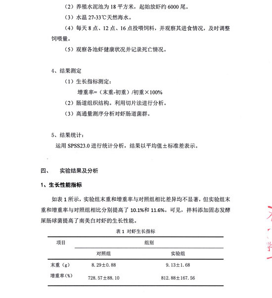 固态发酵屎肠球菌在南美白对虾上的中试应用结果
