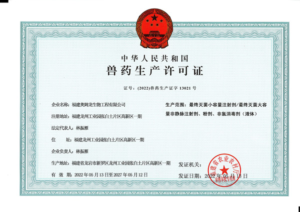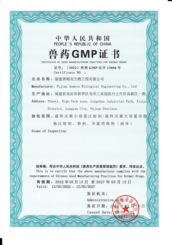 兽药GMP专家组认真听取了我司兽药GMP运行情况的详细汇报。随后,深入生产车间、仓库、化验室等进行现场检查、考核。 经过专家组认真考评,得出综合评定:推荐福建奥姆龙生物工程有限公司最终灭菌小容量注射剂/最终灭菌大容量非静脉注射剂、粉剂、非氯消毒剂(液体)为兽药GMP合格生产线。