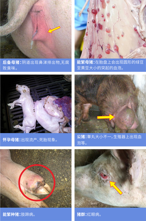 母猪发生流产、死胎、胎衣不下、弱胎和不孕等繁殖障碍性传染病仔猪发生肺炎、肠炎、多发性关节炎、结膜炎、尿道感染等多种传染病不同年龄、品种的猪均可感染本病。