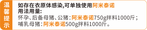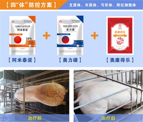 每吨饲料添加阿米泰诺1kg+奥力磺1kg+奥康得乐1kg,连续饲喂15天,治疗用量加倍。