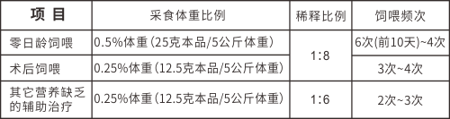 2、干法饲喂:按照上表采食体重百分比和饲喂频次,称量适量奶粉,直接饲喂或拌在主粮一起饲喂。