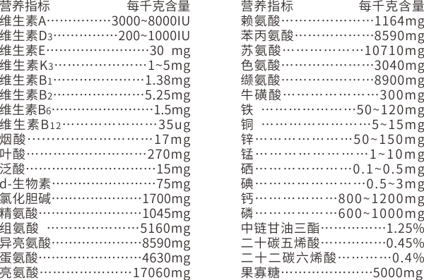 【原料组成 】11种犬必需氨基酸、?;撬?、中链甘油三酯、Ω-3(亚麻酸+ EPA+ DHA)、复合维生素、复合微量元素、果寡糖、羊奶粉(载体)等。