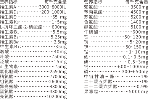 【原料组成 】12种必需氨基酸、中链脂肪酸(MCT)、Ω-3(亚麻酸+ EPA+ DHA)、乳酸钙、膳食纤维、复合维生素、复合微量元素、果寡糖、鸡肉粉和奶粉(载体)等。