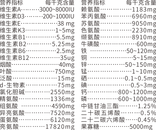 12种猫必需氨基酸、中链甘油三酯、Ω-3(亚麻酸+ EPA+ DHA)、复合维生素、复合微量元素、果寡糖、羊奶粉(载体)等。