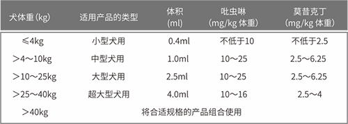 【用法与用量】 以本品计。外用:一次量,每1kg体重,犬0.1ml。预防或治疗期间,每月给药一次。为防止犬舔舐,可将本品滴于犬背两肩胛骨之间到臀部的皮肤上,可分3~4处滴加。给药疗程详见说明书。